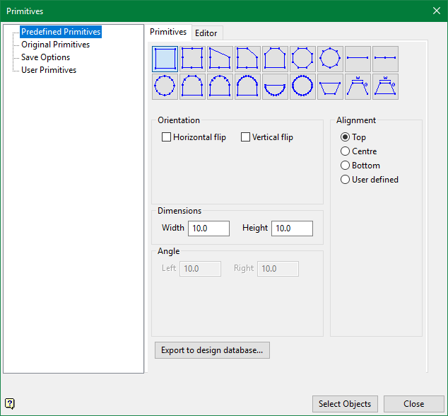 Use the Select Objects button to assign a chosen primitive, and the Close button to exit the Primitives interface. The Select Objects button will be disabled when using the Save Options section of the Primitives interface.