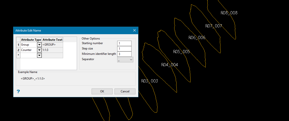 Use the Name option to apply a name to a specific object or to all objects in a group, feature or layer.