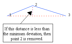 You will need to specify the minimum distance between a point and the line joining the points either side of the point in question. The point will be removed if it is closer to the line than this value. The measurement format (i.e. metres or feet) for the value is also displayed. Refer to the Map Window tab of the New design parameters option for more information on specifying the measurement format.
