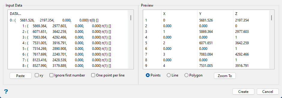 6. Enable One point per line to extract only one point per copied line of data. Without this option enabled, it will extract an XYZ point using the first three numbers found on a line, the continue using the same line to extract the next XYZ values.