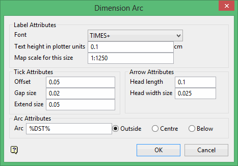 To put a dimension onto the arc shown in Diagram 4, select the centre of the arc as the starting point (point 1 in Diagram 3) and set the distance away from the centre to where the check marks are to be placed as the radius point (point 2 in Diagram 3). The sweep point denotes the sweep of the arc (point 3)