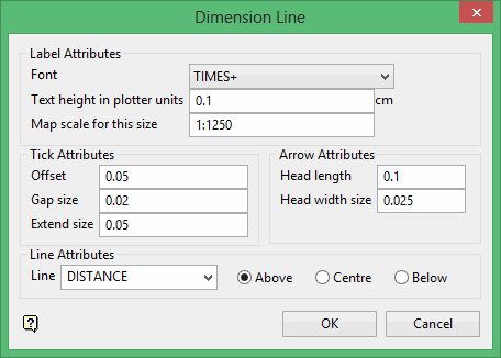 It is possible to annotate the line segment with its distance (measured in the units specified in the project specification (.dg1) file), gradient or a user-defined annotation. To annotate distance or gradient, select the appropriate dimension from the drop-down list.