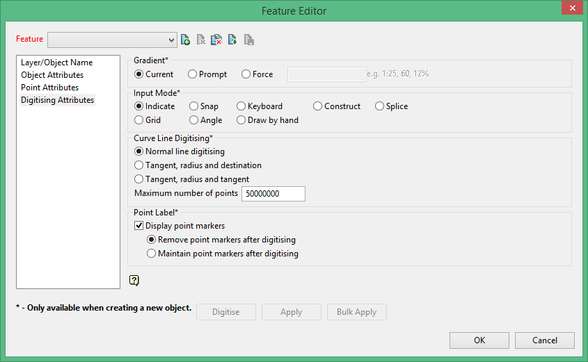 This allows you to set the default mode for digitising an object with this feature. Refer to the Digitising section for details on the available design entry modes.