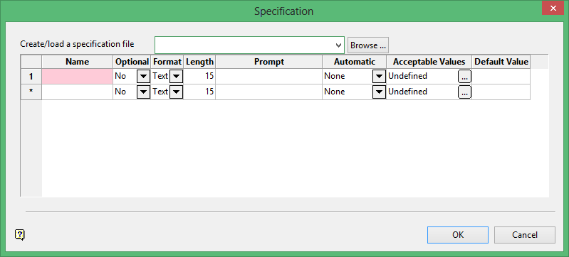 Use the Create/Edit Specification option to define the general settings for the Metadata submenu. The settings will be stored in a nominated Metadata specification file (.mds).