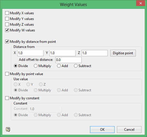 Use the Weight Point Values option to weight point values (X, Y, Z or W) by the distance from a reference point, or another point value in the same coordinate (i.e. you can modify the X coordinate with the Z coordinate) or a constant value.