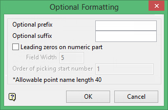- If you have selected to Name by Point Sequence Number or Name by Order of Picking, use the Optional formatting section to define any desired prefix, suffix, or leading zeros. You may also define the starting number.