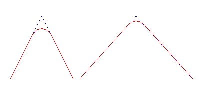 With the constant radius option, the radius of the curve is constant and the distance from the apex (angular corner) to the point where the curve intersects the line segments (d1and d2in Diagram 1) varies depending upon the angle at the apex. In Diagram 2 the blue lines represent the original shape and the red lines represent the shape after a curve or radius 8m (and 5 points) has been applied.
