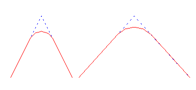 With the constant tangent option, the distance between the apex and the point where the curve intersects the line segments (d1and d2in Diagram 3) remains constant and the radius varies as the apex angle changes. In Diagram 4 the blue lines represent the original shape and the red lines represent the shape after a tangent (distance between the apex and the point where the curve intersects the line segments) of 15m (and 5 points) has been applied.