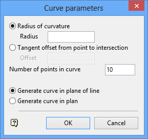 Use Apply Curve to apply a curve of a nominated radius or tangent to strings. This option is useful for many situations where an angular corner must be rounded off. For example, where a road centre line bends too sharply or where a pit outline is too angular.