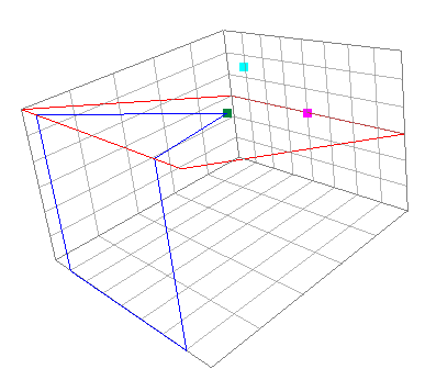 In the diagrams below a 3D grid and perspective mode have been used to emphasis the 3D nature of the images. A plane is defined by the top line segment of the blue rectangle and the pink point (see Diagram 2). Points lying on this plane are then inserted into the line segment (see Diagram 3).