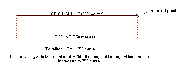 Note: Enter the length (in real world units) by which to lengthen or shorten the line. The distance value can either by entered as a new line length (relimiting to a nominated distance), or as the distance relative to the chosen point (relimiting by a nominated distance).