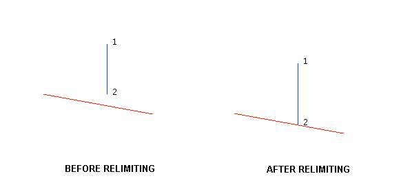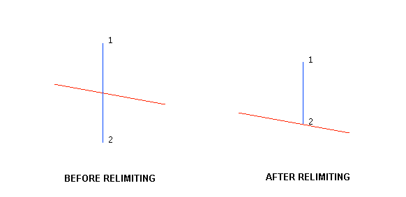Use this option to relimit a line to its intersection (or projected intersection) point with another nominated line. Unlike Multi Line Relimit, any point of a line may be relimited, since not only the endpoint segments are compared to the limit line.