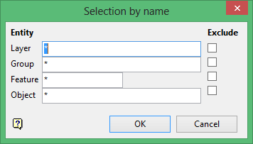 Enter any combination of Layer, Group, Feature, and Object names that you want to select. To include all names for a particular attribute, enter an asterisk ( * ) for that attribute. If you want to exclude a layer, group, feature, or object by name, click the Exclude checkbox next to the name. |