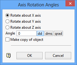 This panel allows you to specify the axis about which to rotate, the rotation angle and whether to make a copy of the object at its rotated location or to rotate the original object.