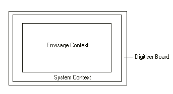 The Vulcan Context is by default the same size as the System Context. To change this, use the panel that displays upon selection of the Configure WinTab Context option. If the size of the Vulcan Context is smaller than the System Context, the digitiser puck will fall through to the System Context when outside the Vulcan Context. Inside the System Context, the puck behaves as a mouse. This provides a streamlined approach, the digitiser can control both the mouse and the digitiser functions.