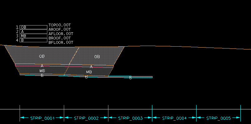 Insitu blocks are created on each section by intersecting each strip's highwall profile with each section's horizon surfaces. On each section, the number of insitu blocks created will be equal to the number of strips times the number of horizons. Insitu blocks of negligible area are automatically classed as Null blocks and are made invisible.