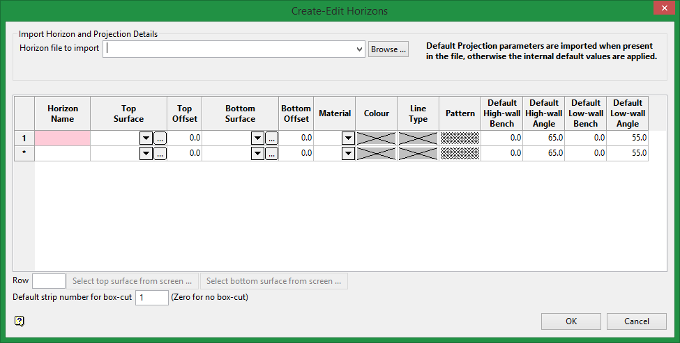 - If using a surface model: Either pick the relevant model from the drop-down box or browse for the model. The Offset can be used to apply a positive or negative offset to the specified model. This is useful for creating prestrip horizons a specified distance above an existing coal surface model.