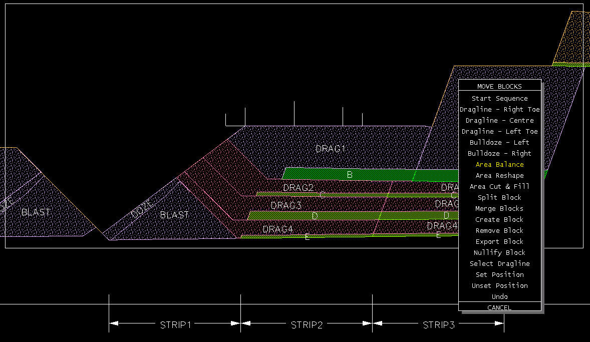 The Dragline module is ideal for stratigraphic strip mining operations and provides a suite of tools to deal with range diagrams, reclamation and general section design. Great flexibility is provided in creating very detailed range diagrams. You can effectively simulate the operation of a dragline, cast blasting, bulldozing, truck and shovel operations, and any other kind of material movement, to develop a series of optimised range diagrams.