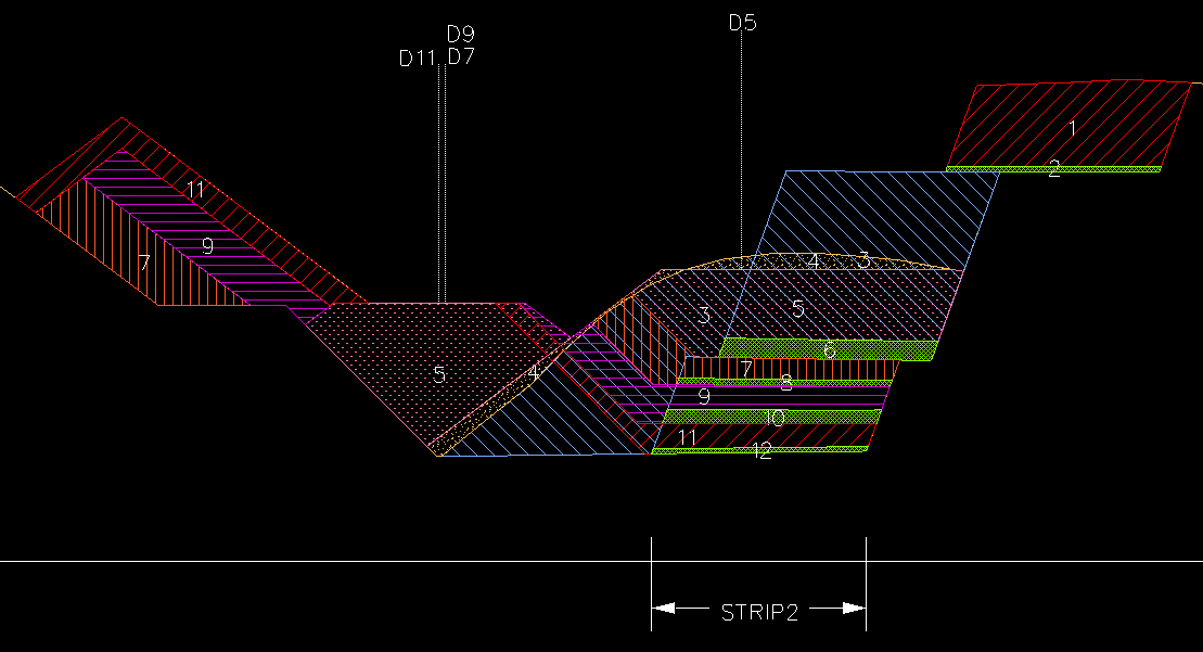 Support for grids, triangulations, and Vulcan design objects, allows easy development of in situ block layouts. Intersections between cross-section lines, strip plans and horizon surfaces are calculated automatically, to generate the initial range diagram sections quickly and easily. Full control is provided in setting highwall angles and bench offsets.