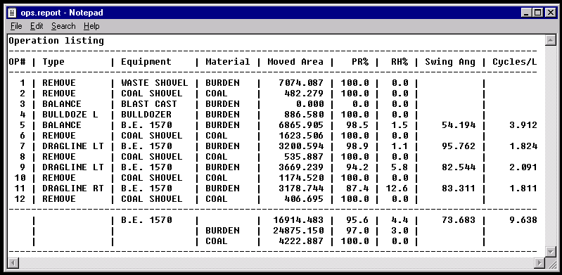 Complete, parametric control of all functional dragline dimensions provides a powerful, graphical tool for analysing dragline capabilities and limitations. Average dragline cycles and swing angles are also calculated.