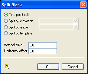 Use the Split Block option to split a block on the current section into two new blocks. It is possible to split the blocks using several methods, by two points, by an angle, by an elevation and by a template.
