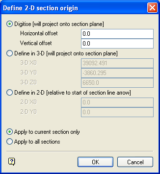 Select this option to digitise the section origin on the screen. The digitised point will be projected to the nearest point on the section plane (if not already on the plane) and will then have the specified horizontal and vertical offsets applied to it.