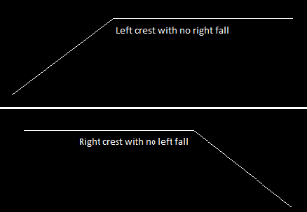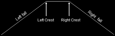 Refer the diagram below to understand the left and right crest in the resulting bench template. Left crest can have a right fall and right crest can have a left fall but they are optional. Enter the relative value of the fall if you select this option. By default, it is 37.0 decimal degrees (dd).