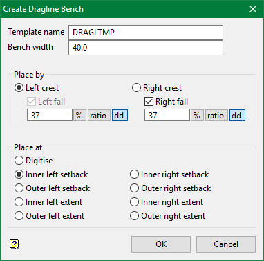 Use the Create Dragline Bench Template option to create bench templates that allow dumping spoil to form a bench for the dragline to sit on.