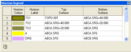 Use the Horizon Legend option to display a legend, showing the horizon numbers, colours, labels and surfaces of the horizon table, which is created through the Horizons > Create Horizon option.