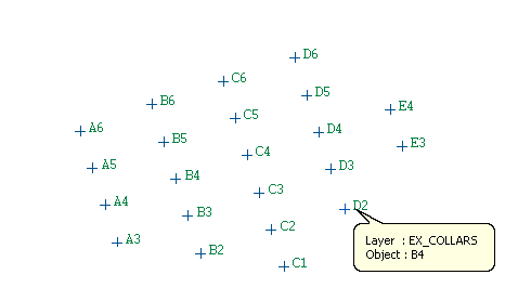 The blast name will be used to name the resulting objects while each point will be named after it's corresponding hole collar/toe. The exported points will also be assigned a group code that relates to the exported information, For example, COLLAR for collar points, TOE for toe points, TARGET for target points and INT1, INT2 etc. for interval points.