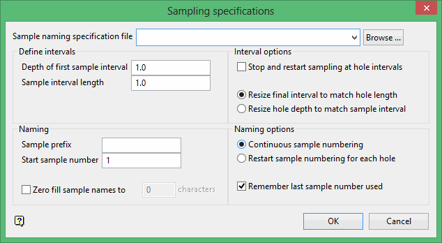Use the Sample Interval Specifications option to create a Sampling specification file (.hsn) or, if applicable, edit an existing one. The resulting specification file can then be used to create intervals in blast holes when exporting an existing blast pattern into a nominated Isis database. Refer to the Export to Database option for more information on exporting existing blast patterns.