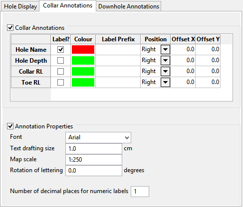 Create drillholes from two reference lines: The collar line and toe line. You can also display attributes, names of holes, drill rig, and loading style if desired.