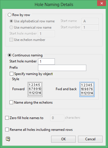Select this option to use continuous naming when assigning the hole names. You will be required to specify the start hole number and prefix, as well as select the naming style.