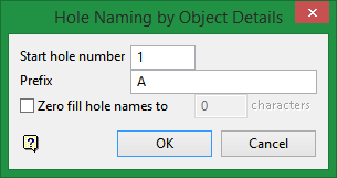 A blast must be loaded to run this option. You will be prompted to select the blast and the hole naming options are displayed for modification, if required. You must also select a design object which will control the continuous naming sequence of the holes in the selected blast.