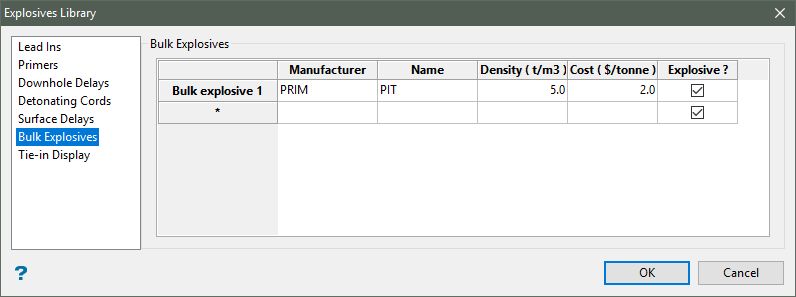 Use the Bulk Explosives section to define bulk explosives information including the manufacturer name and the bulk explosive name, density, cost, and whether to include the bulk explosive in explosive and powder factor calculations.