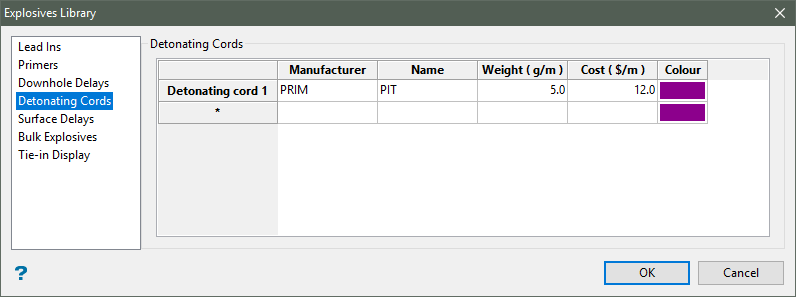 Use the Detonating Cords section to define the detonating cords information including the manufacturer name and the detonating cord name, weight, cost, and colour.
