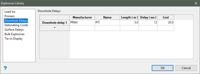 Use the Downhole Delays section to define the downhole delays information including the manufacturer name and the downhole delay name, length, delay time, and cost.
