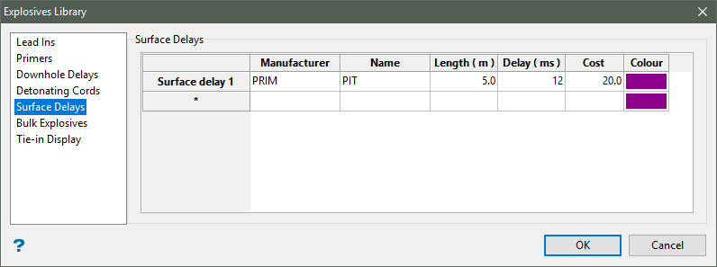 Use the Surface Delays section to define the surface delays information including the manufacturer name and the surface delay name, length, delay time, cost, and colour.