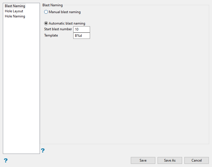 Select whether you want to use automatic or manual naming when creating a new blast.
