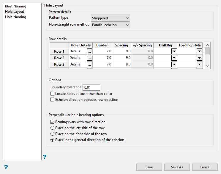 Set the pattern details. This section determines if the holes and rows of a blast are positioned as a square, staggered, or equilateral.