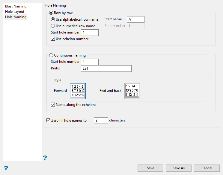 1,2,3etc. You will need to specify the start hole number.Select Use echelon hole naming if you want to adjust the hole numbering for the rows so that the numbers follow echelons. If this option is enabled, then the holes will be named according to the hole name located in the row diagonally above, in an oblique or step-like formation.