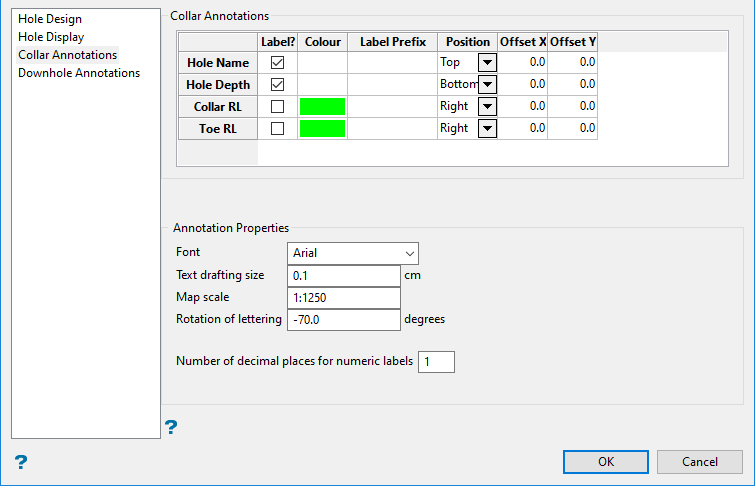 The Downhole Annotations tab is used to set up labels that will be displayed at the bottom of the drillhole.