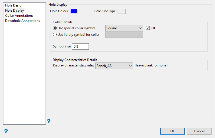 The Hole Display tab is used to set the display characteristics for the blast holes.
