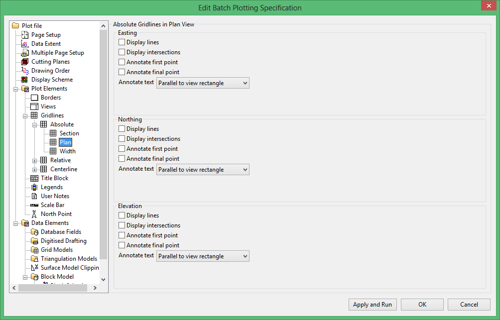 Select this checkbox to display a symbol (+) to represent intersection of gridlines. The size of this symbol is set through the Gridline section (either Absolute, Relative or Centreline).