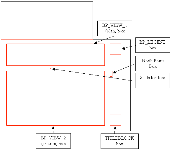 You will then be placed in the Drafting window, which will have the A0 template (both landscape and portrait) outline displayed. You will need to create different boxes to represent the various objects that you want to include in the plot. The colour and line style of these boxes will be the defaults, which are displayed in the Status toolbar.