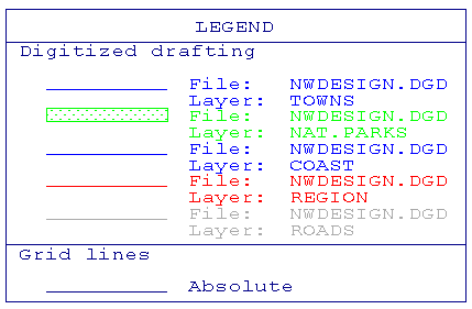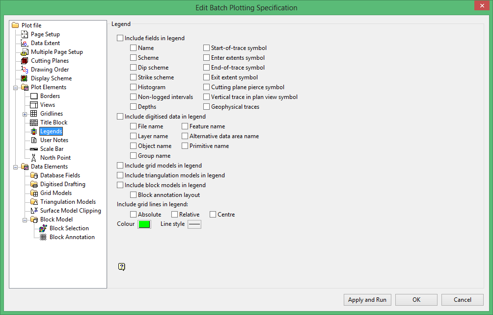 The Colour and Line Style fields at the bottom of this section allow you to select the colour and line style of the Legends box. The colour of the legend items will, of course, depend upon the colour of the data element.
