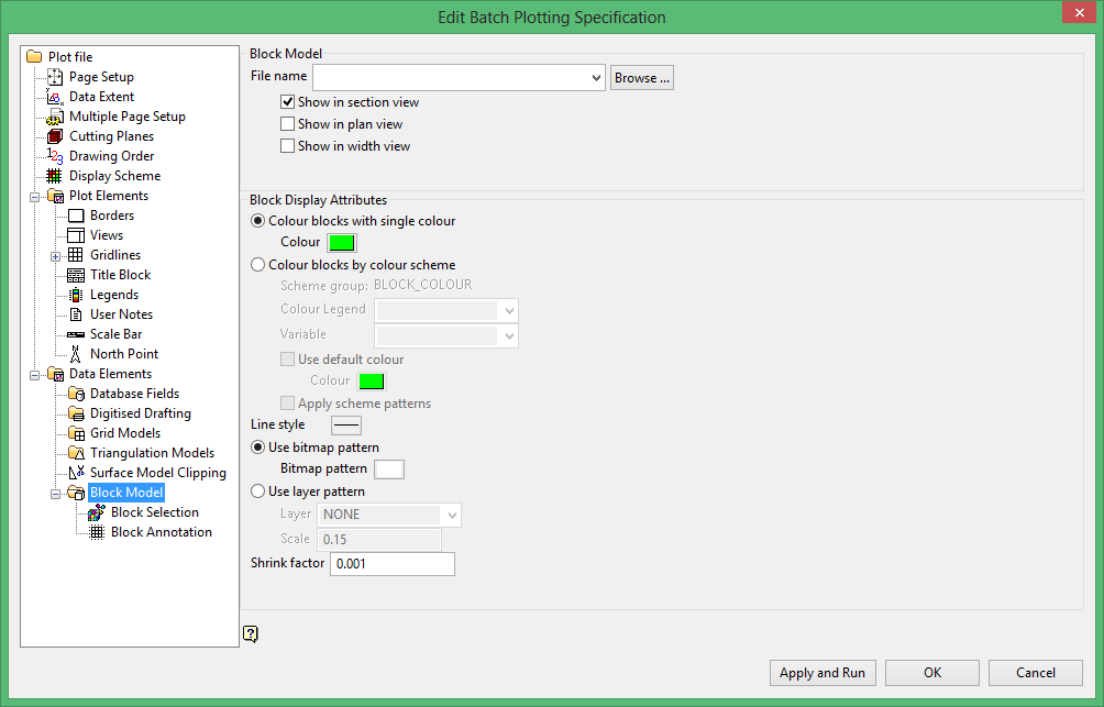 Select this option to use a scheme to colour your block model in the plot. You will need to select the colour legend and block variable from the drop-down lists.