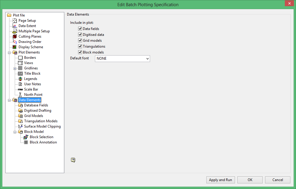 Set the Default font attribute that will be used if any of the Annotation options are utilized in the individual Data Elements set up panels, for example, drillhole and lock annotations. This option controls the font style for annotations not pre-existing as digitized design data.