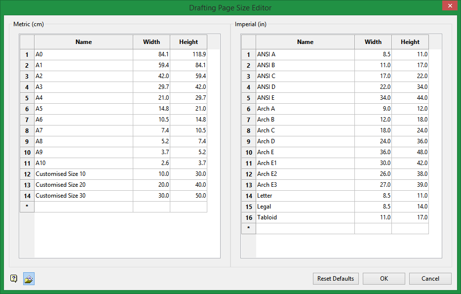 Use this option to define the default page sizes used in the Drafting Sheet Editor. Custom sizes can also be defined.