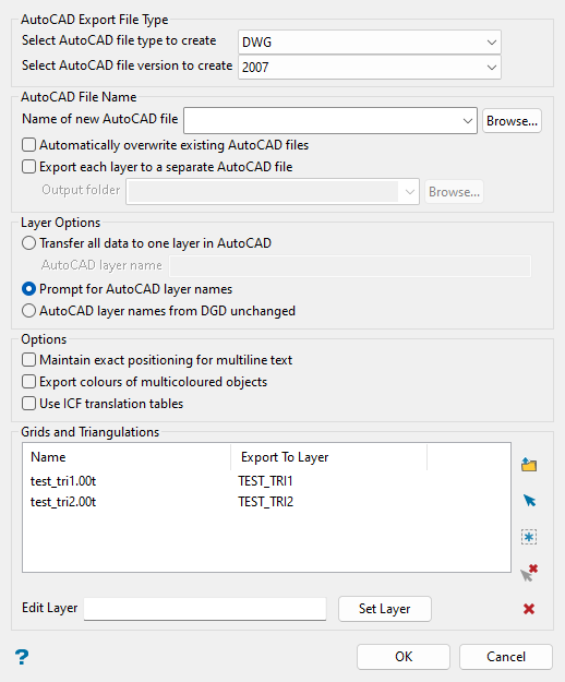 The default layer name in the Export to Layer column will be the name of the triangulation or grid. To change the layer name, highlight the layer in the list, enter the new name in the Edit Layer text box, and click Set Layer. This will change the layer name in the list.